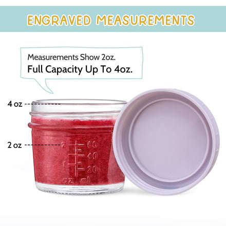 • 4OZ REGULAR CAPACITY WITH SCALE MARKS: 6 packs of the set, each of 4oz. Great and enough for daily baby food preps. And with the engraved measurements, It can be quickly and accurately filled to the desired capacity. The whole capacity up to 4oz if you fill it to the very edge of the jar, but the scale marks on the body show up to 2oz to make sure you can clearly see the capacity from the outside without opening the lid.