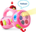 Light up and learn with the spin & learn Color flashlight from VTech. The toy flashlight excites as it glows with a rainbow of five colors and plays exciting songs and music. Change the colors and listen to five fun animal sounds as you spin the dial and learn about colors and animals. Press the engaging ladybug button to hear phrases and sounds that teach numbers to playful melodies or Count along and learn the numbers 1, 2, and 3. Over 50 sing-along songs, music, sounds, and phrases engage learning fun. With its easy-to-grip handle, your toddler will want to take this learning toy flashlight with them on every adventure.