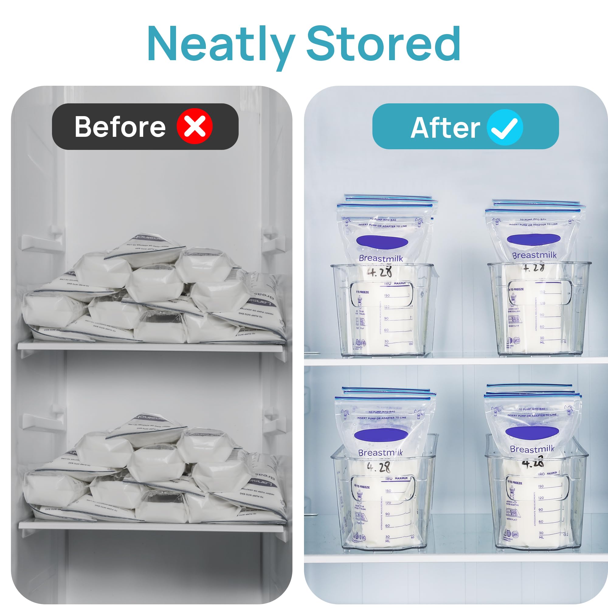 • Perfect Size ---- The set comes with 4 narrow organizer bins. The size of each clear organizer bin is: 14.5’’ L x 4.3” W x 3.8” H, perfect size for most breast milk bags and compact enough to fit in the fridge without taking up too much space. These baby bottle organizers would fit front to back in the refrigerator or freezer perfectly, so you will not get frustrated about milk supplies getting lost in the freezer.