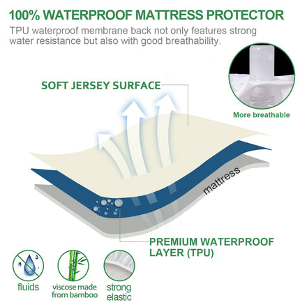 • Waterproof and Noiseless: Waterproof twin mattress protector made of natural cooling viscose made from bamboo jersey fabric with 100% waterproof Layer on the back to protect your precious mattress keep away from all kinds of liquids including fluids, perspiration, bedwetting and stains. Because of the noiseless TPU layer, you will not hear any noise when you sleep on it.