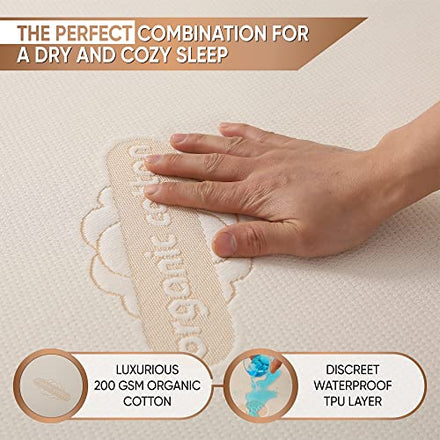 • CERTIFIED ORGANIC COTTON: Experience a gentle touch with a top layer of certified Organic Cotton, backed by efficient waterproofing through a TPU layer. Certified by OEKO-TEX for optimal comfort. Breathable and Skin-friendly. The knitted jacquard finish of our organic cotton provides a smooth, modern feel. While some may mistake this texture for synthetic material, rest assured, the top layer is 100% certified organic cotton.