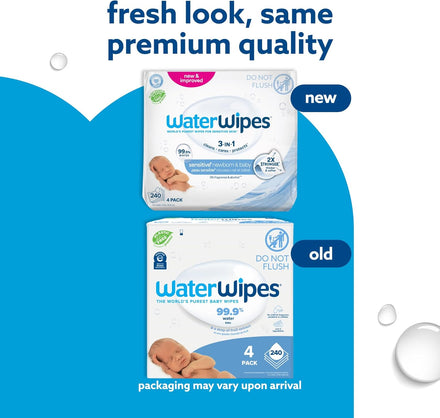WaterWipes Original Baby Wipes, 99.9% Water-Based Wipes, Unscented & Hypoallergenic for Sensitive Skin, 240 Count (4 Packs), Packaging May Vary