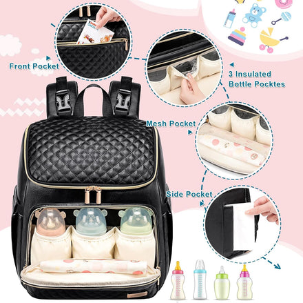 • 【Durable Build & Stylish baby bag】Baby diaper bag/ pañaleras para bebe With a sleek quilted design and gold-tone zippers, toddler diaper bag blends fashion and function. The high-quality faux leather diaper bag exterior resists wear, while the waterproof nylon interior protects contents. Available in multiple colors, it’s a diaper bag essentials for moms who want practicality without sacrificing style.