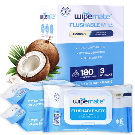 Wipemate Ultra Flushable Butt Wipes, Soothing Vitamin E & Aloe, 99% Water, Coconut Scent Premium Super Soft Hygiene Wipes, Septic & Sewer Safe, 3 Premium Flip-Top Packs, 60 Wipes Per Pack (180) Ct