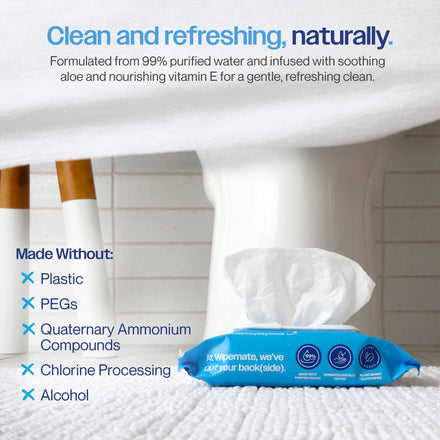 • 🌱 YOUR BUTT'S BEST FRIEND! 99% WATER-BASED LARGE FLUSHABLE HYGIENE WIPES FOR SENSITIVE AREAS: We aimed to outspeck every butt wipe on the market! Upgrade your bathroom routine with Wipemate's premium flushable moist towel tissue wipes engineered for comprehensive cleanliness. Our unique formula erases mess, neutralizes odors, and ensures a deeper clean beyond the surface. Each generously sized wipe (7.8 x 5.7 inches) effectively tackles the dirty work, leaving you confidently fresh.
