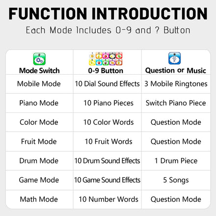 • TODDLER TOY GIFT: 8 modes( mobile mode, piano mode, color mode, fruit mode, drum mode, game mode, maths mode and question mode) for baby to grow in interaction. It is a great Christmas gift for boys and girls