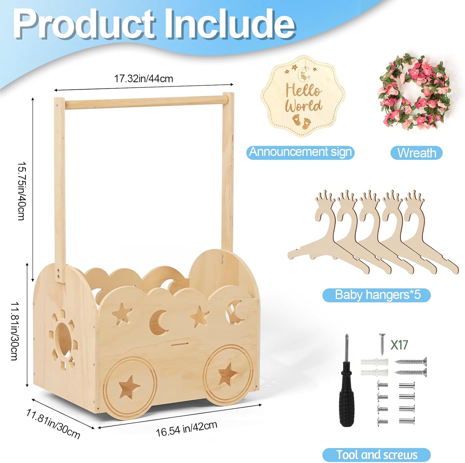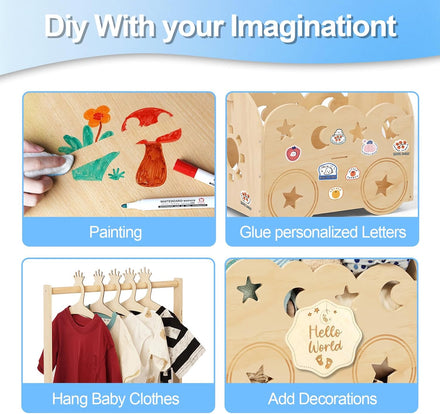 - π Ready to Gift: This extraordinary baby shower crate closet contains 1 baby announcement sign, 5 baby hangers, 1 eucalyptus wreath, a pack of screws (26pcs), 1 installation manual. Parents will cherish this timeless wooden keepsake long after the baby outgrows infancy.