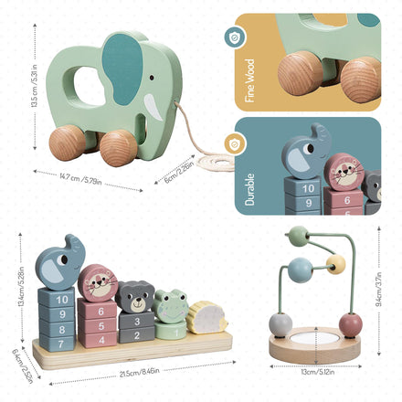 • 3-in-1 Set: This Montessori educational toys set includes a stacking toy, pull along toy and bead maze helping toddlers to develop fine motor skills, hand-eye coordination and problem solving through engaging and interactive play.