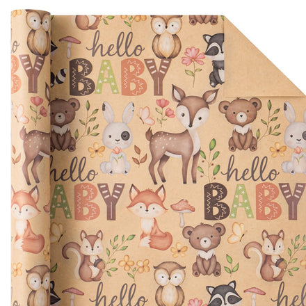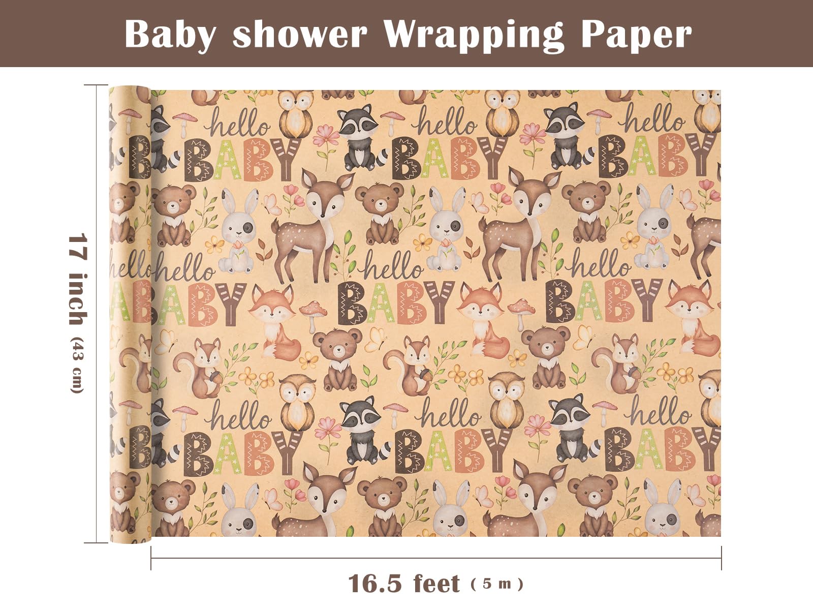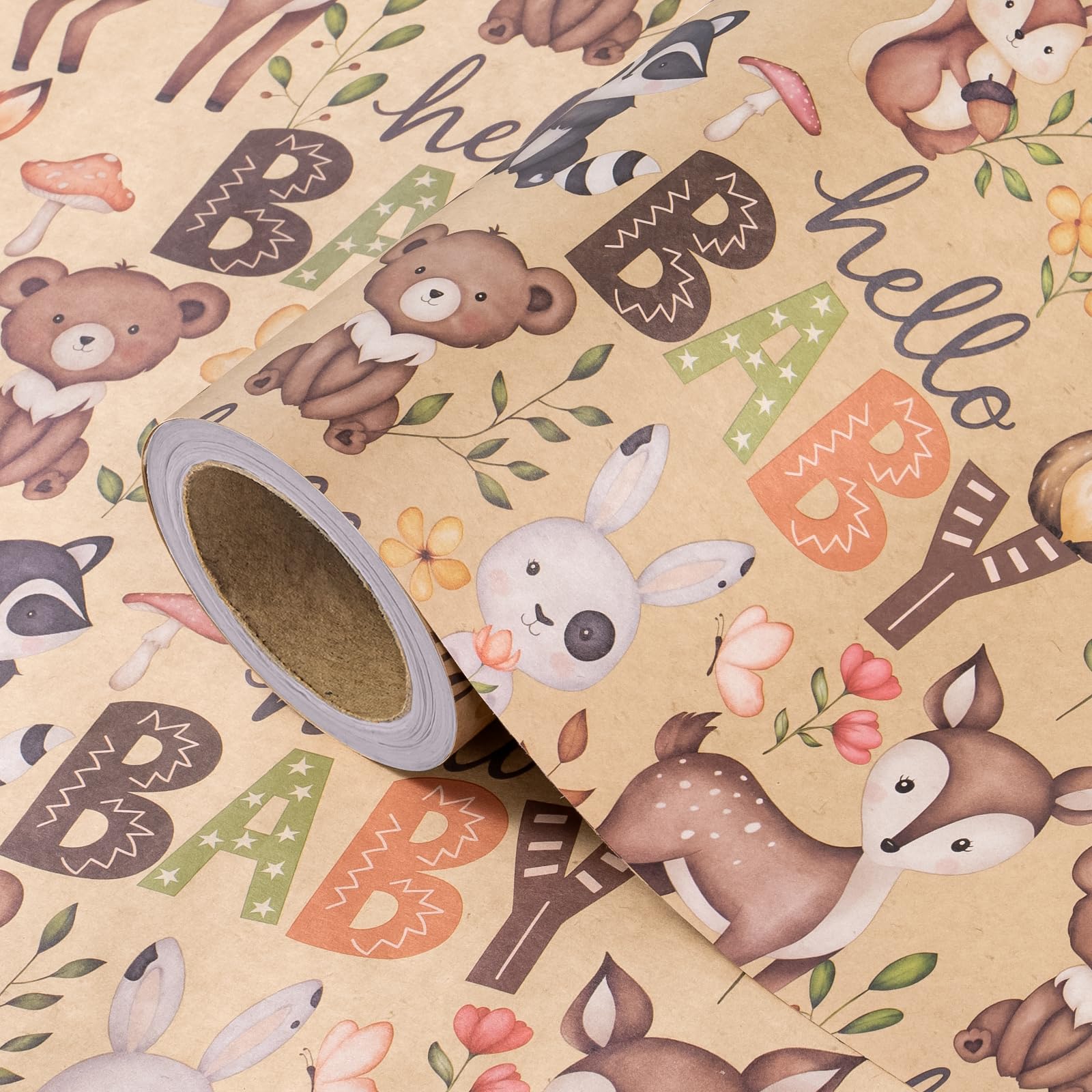 WRAPAHOLIC Kraft Baby Shower Wrapping Paper Roll - Mini Roll - 17 Inch x 16.5 Feet - Little Woodland Animal Wrapping Paper for Baby Shower, Kids Girls Boys Birthday