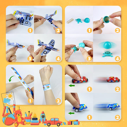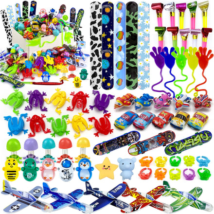 • PACKAGE:You will get 70pcs party favor toys in total:10pcs Jumping Frogs,5pcs Airplanes, 10pcs Blow outs, 5pcs Slap Bracelet, 5pcs Jump up Spring Toys, 10pcs plastic rings,5pcs Pull Back Car, 5pcs Pull Back Plane, 2pcs Mini Toys, 3pcs Finger Skateboards,5pcs Sticky Hands, 5pcs Mini Tumbler Toys.
