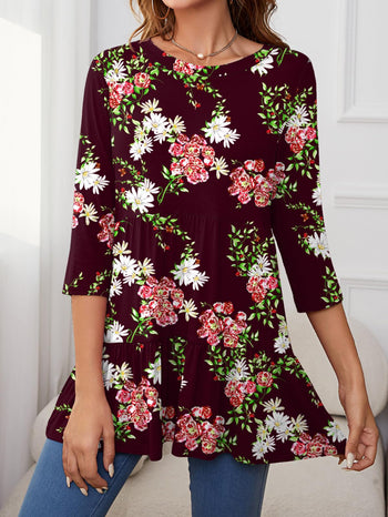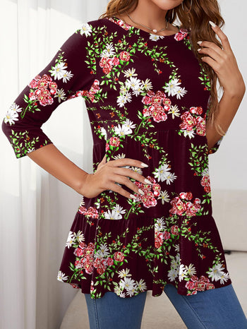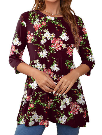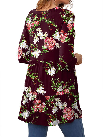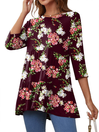 Xpenyo Women Fashion Tops Tiered Shirts 3/4 Long Sleeve Casual Maternity Blouse Shirts Burgundy Flower 2XL