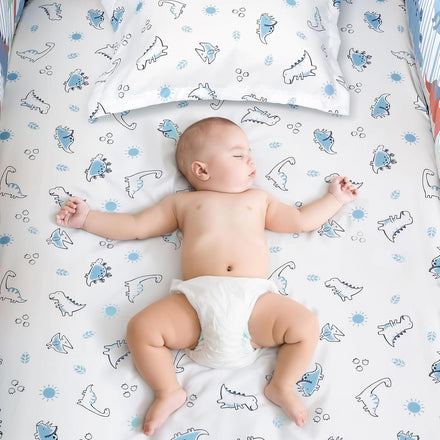 • 1. Dinosaur Theme Baby Bedding: The rich color combination shows the childlike dinosaur friends, adding a playful and soft touch to your toddler or baby's room.
