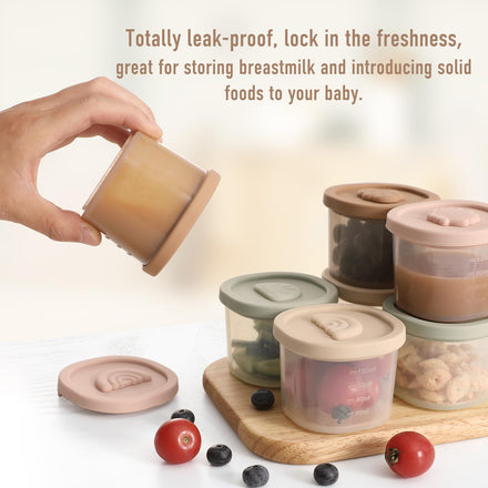 • Safe, Food-Grade Silicone: Available in 4PK and 8PK sets, each baby food container holds 4 ounces. Made from food-grade silicone, these baby food storage containers are safe for the freezer, microwave, and dishwasher. They are certified free from lead, BPA, phthalates, and PVC.
