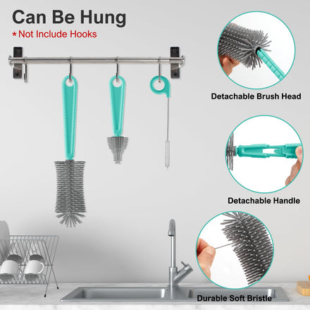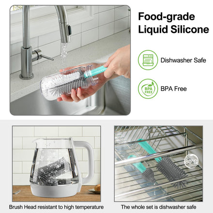 • 【Food Grade Patented Product】The upgraded baby bottle cleaner kit is made of food-grade liquid silicone material, durable and BPA free.The soft bristles will not fall off and wear small,and will not scratch the items being cleaned.Except for the soap dispenser,the entire set is dishwasher safe.The silicone brush head is detachable and can be boiled, but the handle cannot be boiled