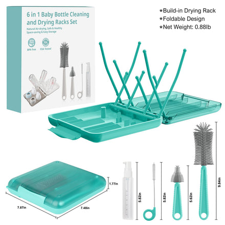 YomauiYee 6 in 1 Bottle Brush Set,Bottle Cleaner Brush Kit with Bottle Brush,Drying Rack,Nipple Brush,Straw Brush,Soap Dispenser&Storage Box,Portable Baby Essentials for Home&Travel