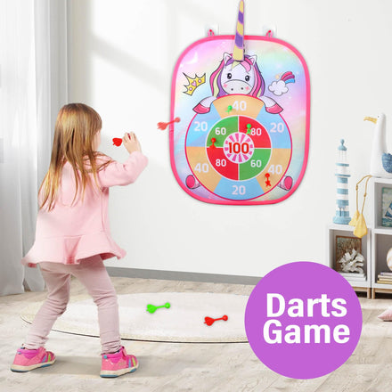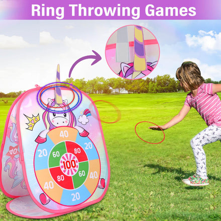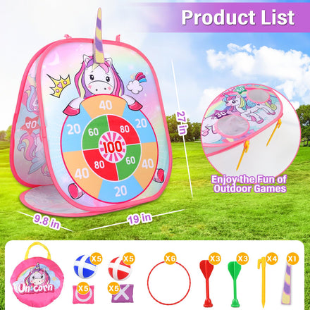 • Unicorn Theme & 5-in-1 Fun: Features a whimsical unicorn design, includes five play modes: bean bag toss, darts, sticky target, ring toss, and tic-tac-toe, offers engaging and imaginative play for kids of all ages