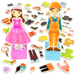 Dress for Adventure with Zoey & Joey!Help Joey and Zoey use their imaginations to save a burning building from a fire, paint an artistic masterpiece, or score the winning goal! Get creative with these wooden friends, mixing and matching their magnetic dress-up clothes, shoes, and accessories.Why You'll Love It:With over 60 magnetic pieces, there are tons of fun outfits for Zoey and Joey to wear, mix or match! There are all kinds of hats, shoes, and accessories -- even a fake mustache. Playing pretend is a great way to sharpen social skills, and dress-up sets are a fantastic source of creative expression. Best of all, the colorful box is made with thick, hardy cardboard and comes with storage compartments for easy organization. All fun, no mess.